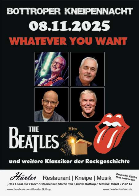 Seit über zwölf Jahren gehört Whatever You Want als Hausband fest zum Maschinchen Buntes in Witten. Zur diesjährigen Kneipennacht gastiert die Band nun im Hürter und bringt ihr besonderes Programm mit – eine Mischung aus frühen Beatles- und Stones-Klassikern, ergänzt durch echte Highlights und spontane Publikumswünsche aus ihrem imposanten Repertoire von rund 800 Songs.